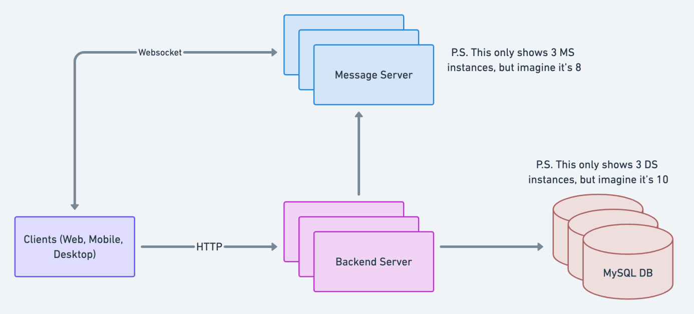 new_msgevents based on our previous assumption. This means the message server will need to send 1.6T (200M events x 8K clients) updates to clients via the WebSocket in a day. Wild. Suppose we assume that one message server can handle 250B events a day. In that case, we are still safe within our 8 message servers calculation from before (250B events x 8 message servers = 2T events). Nice.Before we go, how do should we shard the message server? We know that when the message server receives an update, it needs to fan it out - send it - to all relevant clients. It is much easier to do this if one message server serves all the clients in a workspace. If multiple message servers serve clients in one workspace, then multiple message server instances would need to communicate (think Interprocess Communication or IPC) for a fan out to succeed. We want to avoid that right now, so we shard the message server by workspace, meaning only one message server will handle all clients within a workspace.
