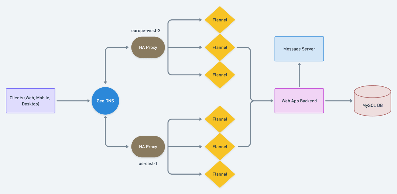 Flannel is deployed across multiple regions, and in each region, there are multiple Flannel instances. Slack uses GeoDNS to route incoming requests to the appropriate edge region based on the client’s geographical location. Once a request is routed to a region, Slack uses HAProxy (in that region) to find the Flannel instance with the snapshot for that particular request and user.